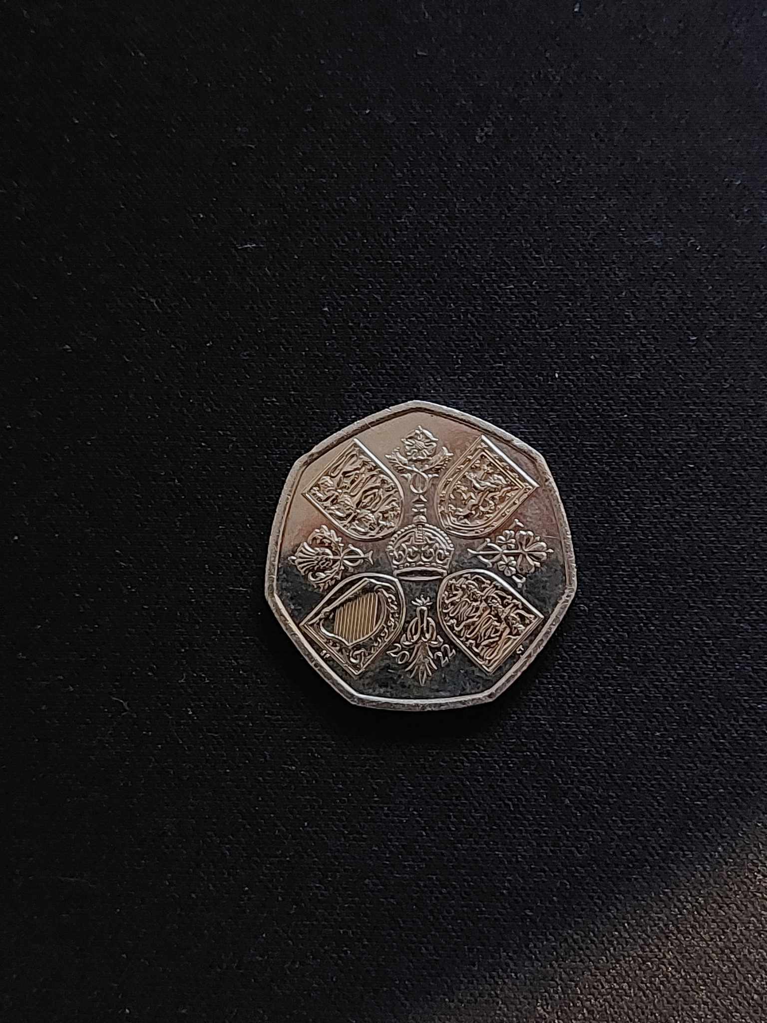 The reverse of the 50p coin features a design that originally appeared on the 1953 Coronation Crown. It includes the four quarters of the Royal Arms within a shield. In between each shield is an emblem of the home nations; a rose, a thistle, a shamrock and a leek.